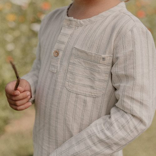 Gekleed voor een nieuw avontuur! Dit mooie linnen-look overhemd heeft een verfijnd Forest Green streepjespatroon. Gemaakt van biologisch katoen en voorzien van een speels borstzakje aan de voorkant. De omgeslagen mouwen zorgen voor een casual, maar toch verzorgde uitstraling, perfect voor zowel speelse als formele gelegenheden. De hout-look knoopsluiting voegt een vleugje rustieke charme toe. Het past perfect bij alle items uit de Forest Friends-collectie, zodat je van top tot teen gestyled bent. Verkrijgbaar in maten 74, 80, 86, 92, 98 en 104.