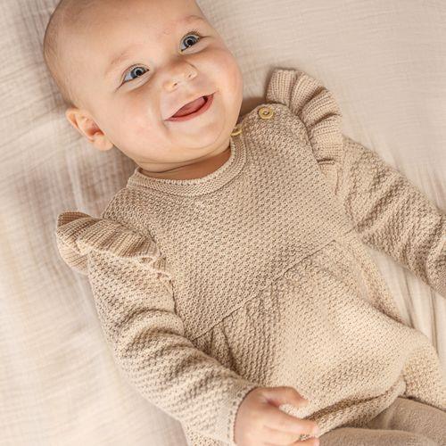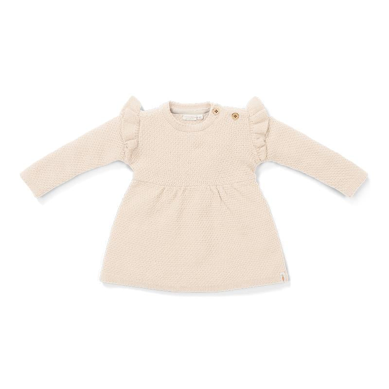 Trek je mooiste jurkje maar aan! Deze zacht gebreide zandkleurige jurk met ruches is de perfecte outfit voor jouw kleintje. De jurk is gemaakt van heerlijk zacht katoen en heeft knoopjes op één schouder, zodat je deze gemakkelijk aan- en uit kunt trekken. Op het jurkje zitten labeltjes met het Little Dutch logo en het wortel icoon. Combineer het jurkje met de maillot Sand en de Baby Bunny babyslofjes. Verkrijgbaar in de maten 50, 56, 62, 68 en 74.